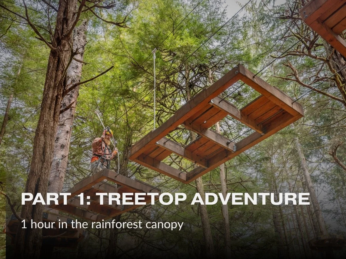Looking for the perfect blend of thrill and tradition? The Sheet'ká Rainforest Park Sampler pairs the first two aerial adventure courses at Sheet'ká Treetop Adventures with the unforgettable Sheet'ká Salmon Tales experience. Spend an hour climbing, balancing, and ziplining through the rainforest canopy, then wind down with a traditional Alaskan salmon bake and Native-led storytelling.